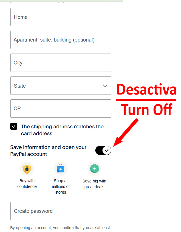 Si prefieres usar PayPal sin crear una cuenta, desactiva o desmarca el botón negro.
